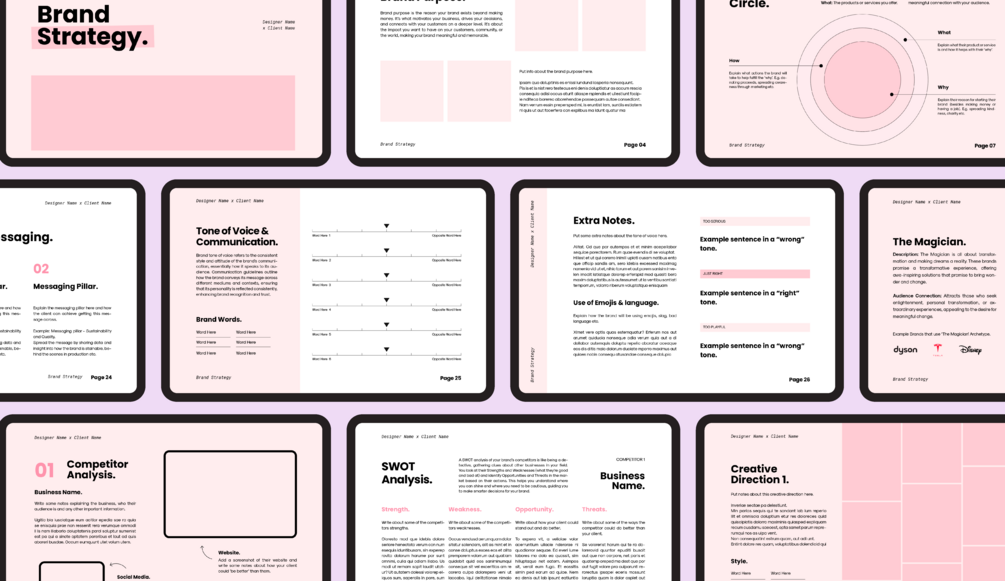 - Detailed Brand Strategy Development: Dive deep into the essence of the brand with structured sections that guide you through crafting a complete brand narrative.